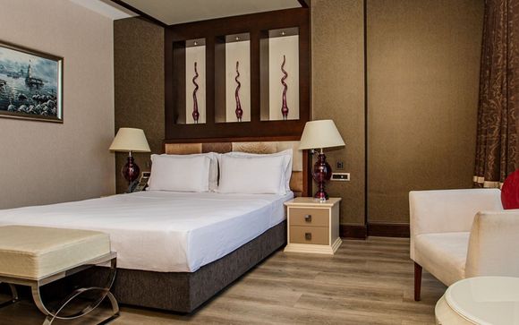 Offering extensive views across Istanbul, this spacious room blends authentic Turkish designs with a chic contemporary style.